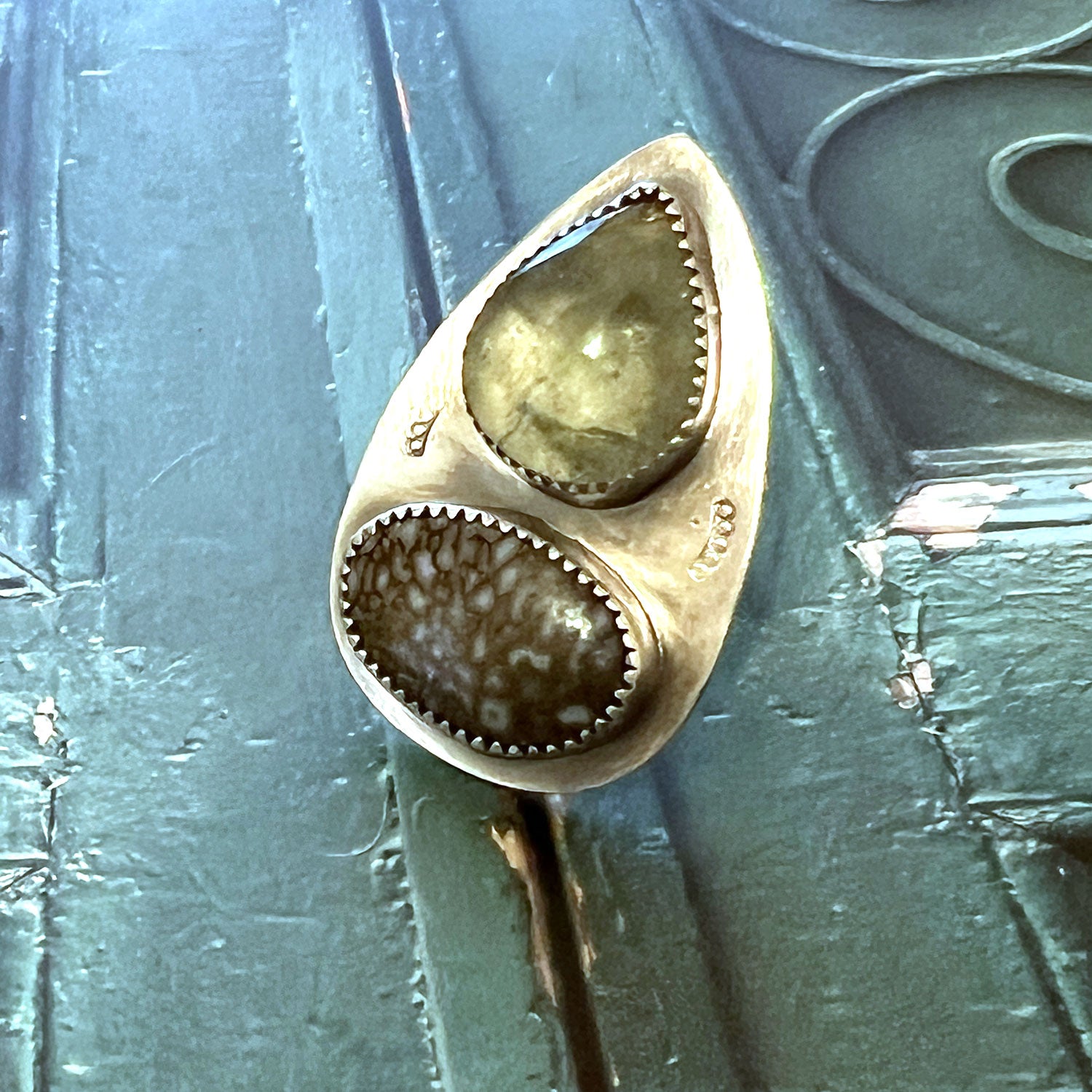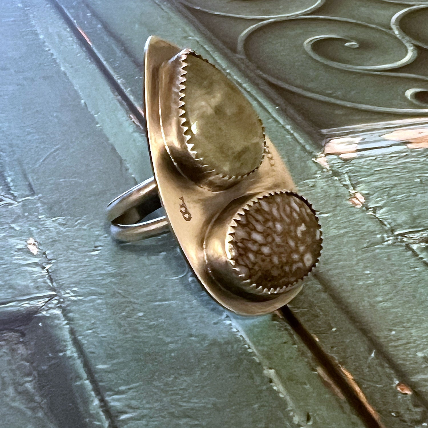 A perfect lustrous statement ring… Aquamarine and DINOBONE captured in fine silver bezels. The Sterling Silver magnifies the natural energy of the stone.