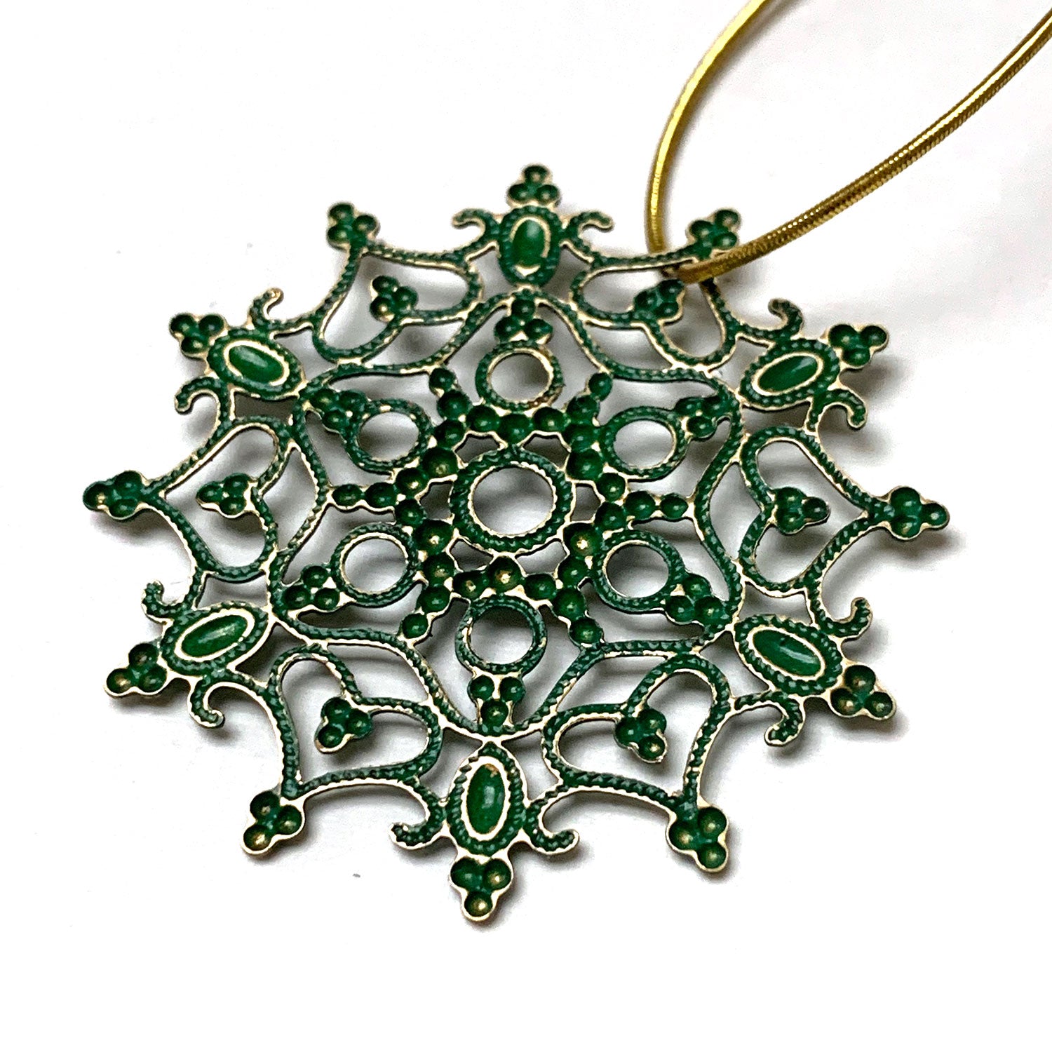 Four sweet, star shaped holiday ornaments for you! These are perfect for Christmas or Saint Patrick's Day or just as a year-round decoration. These are handmade from brass stampings and then patina is applied using inks, guilders paste and other colorants (both sides). A clear, matte acrylic spray is applied to protect the finish for you. This ornament is star shaped with green brushed with gold patina. Ornaments in red are also available as shown in the last photograph.