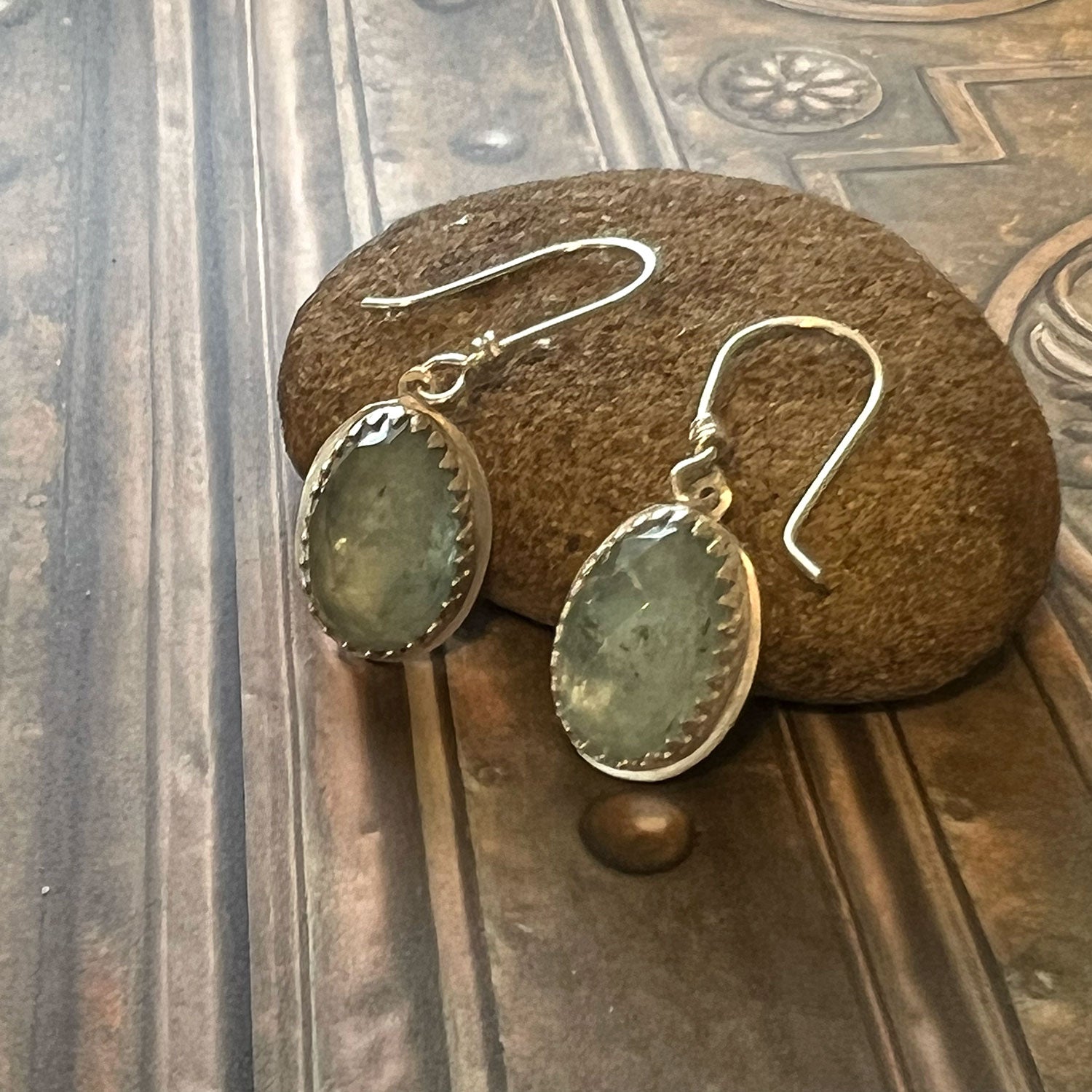 These stunning rosecut Aquamarines are set in sterling silver gallery wire bezels. They are finished with handmade sterling french ear wires. Designed with you in mind as a sea spirit talisman, Aquamarine is said to resonate to the energy of the ocean assisting the wearer to connect with the nature spirits of the sea. This stone is also called a “Stone of Courage and Protection”. It encourages intellectual growth and inner knowledge, opening one up to intuition and the super-conscious mind. Aquamarine can also bring peace and calm to the overactive mind, making it a great aid for deepening the meditative state. Meditating with Aquamarine can bring new insights from the higher self to be applied in daily life. The precious metal findings magnify the energy inherent in the stones.