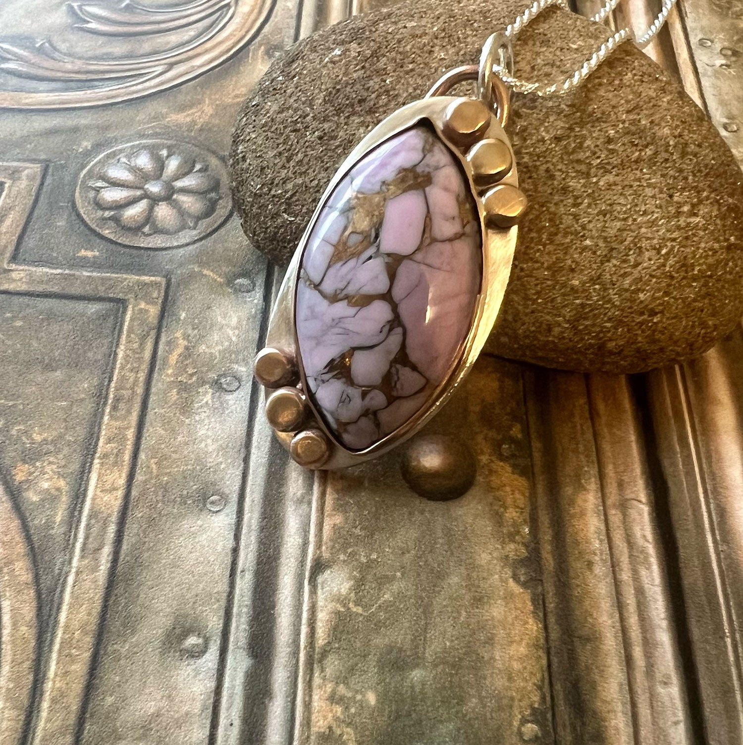 A reminder that Spring has arrived... this marquise Lavendar Dahlia Composite Turquoise stone with a bronze matrix is set in a Bronze bezel atop a Sterling Silver baseplate. The bezel is framed with balled bronze. The necklace is finished with a handmade bronze and sterling bail and an 18-inch sterling silver chain. This necklace is designed to symbolize the protected, sacred space needed to travel the tenuous and fragile path of becoming your spiritual self. It is well known that to be "on the path" one is constantly tested as to their strength of will and commitment to spirit. Turquoise is reported to symbolize the blending of the energy of the heavens with the energy of the Mother Earth. It is also known to provide guidance through the unknown, providing both protection and encouraging independent action... individualization. The precious metals magnify the energy of the stones.