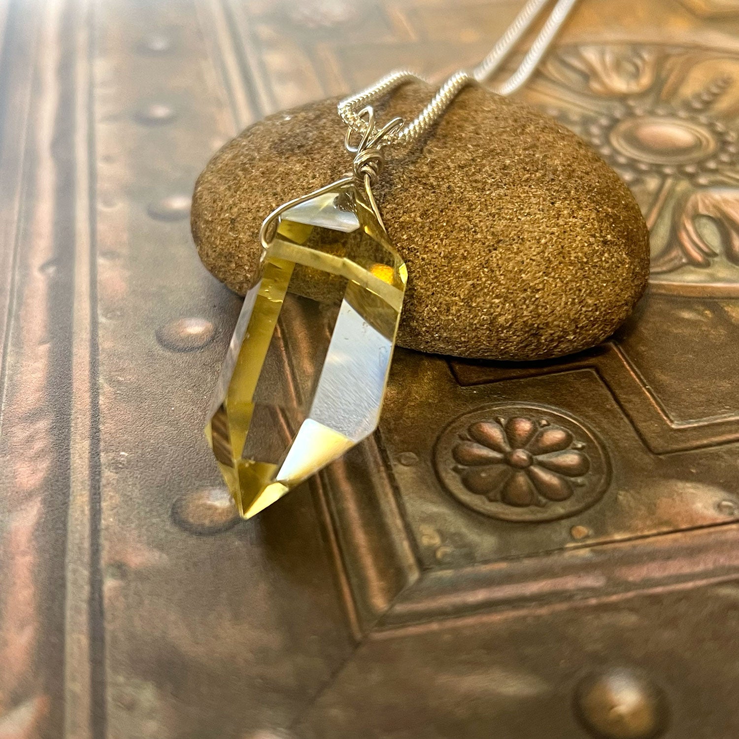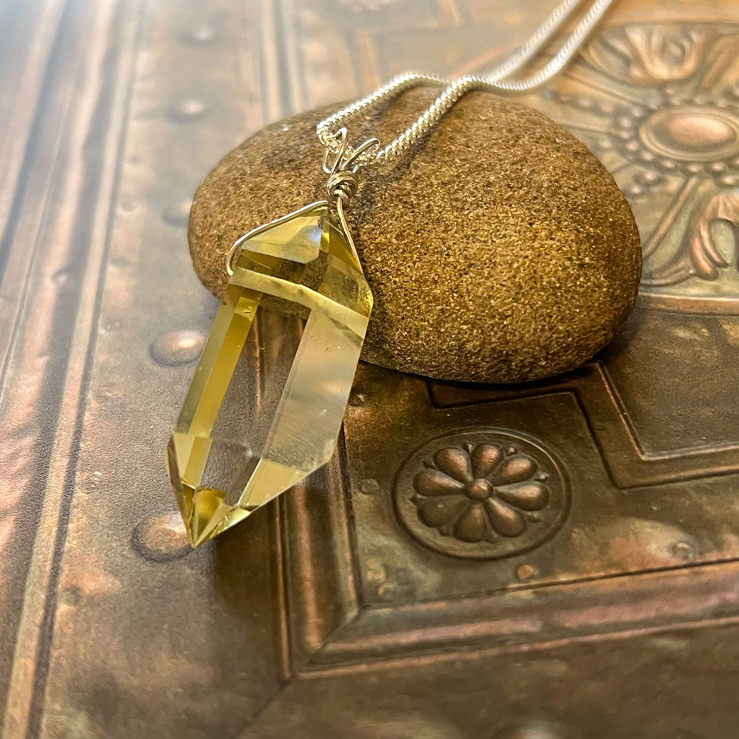 These beautiful double-terminated pendants are made for those of you who love wearing crystals. These pendants make wonderful statement pieces that talk of energy. Amethyst is a Dreamland talisman; the Golden Topaz is a Be Still talisman. They are wrapped in Sterling Silver and finished with an 18-inch sterling silver chain.