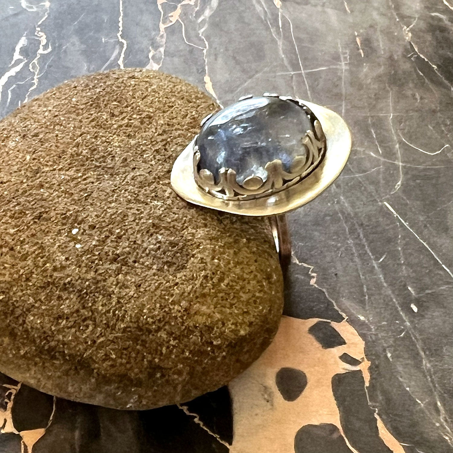 Like the most incredible blue eyes, Dumortierite in Quartz, draws you into the depths of its quartz home. This lovely cabochon is set in a gallery wire bezel... all this sits on top of a sterling silver ring band. The sterling silver has been oxidized. A perfect statement ring. This ring is designed to symbolize standing up for yourself. Dumortierite in Quartz is reported to be good for building self confidence, organizational skills and self-discipline. The sterling silver magnifies the natural energy of the stone.