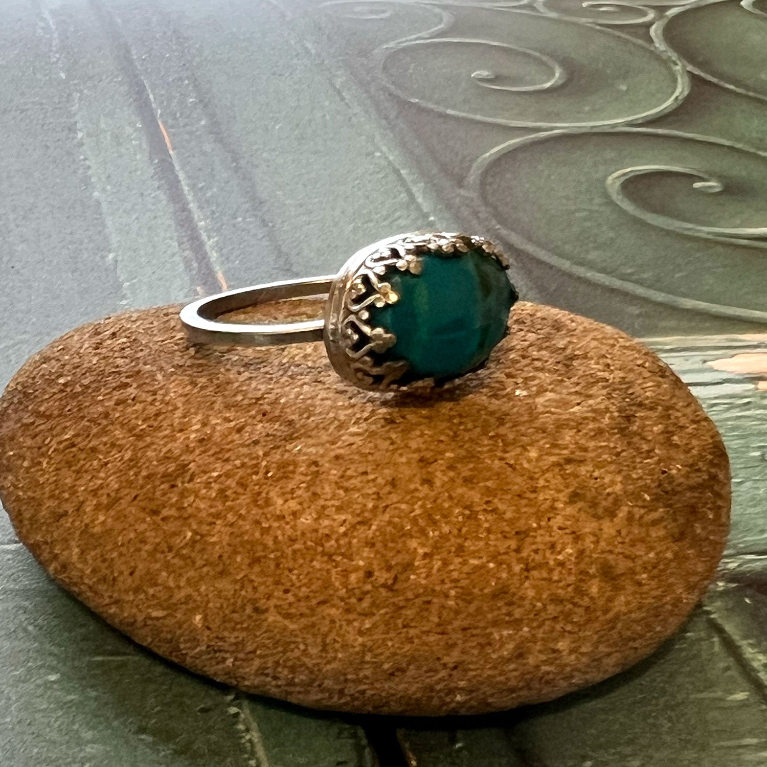 This Sterling Silver Gem Silica ring was designed around this stone blazing in shades of teal. The stone is set into an inverted heart sterling silver gallery wire bezel. It is finished with a sterling silver square ring band. The ring was designed to symbolize the ability to speak from lies in the heart, your inner truth. The Sterling Silver magnifies the natural energy of the stone.