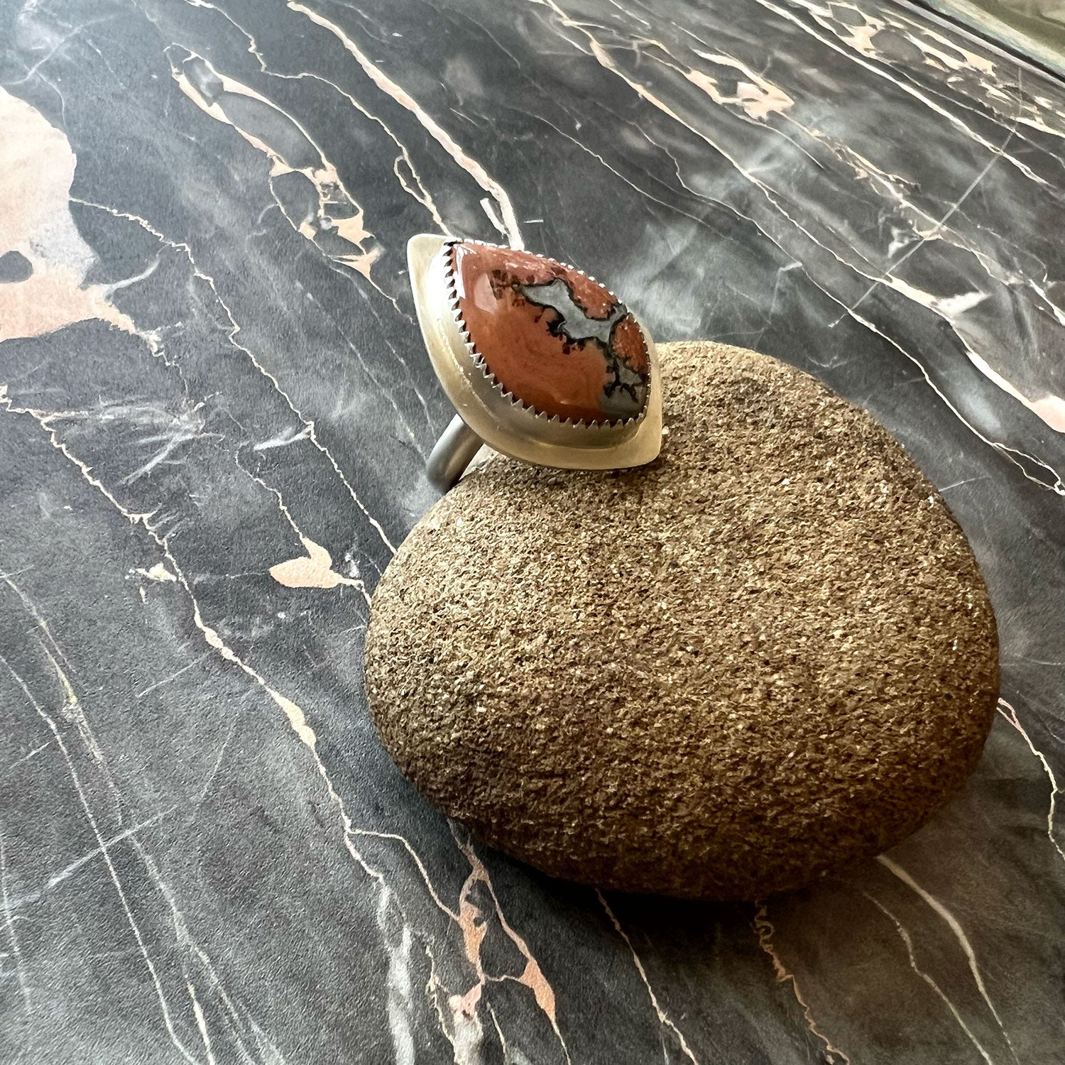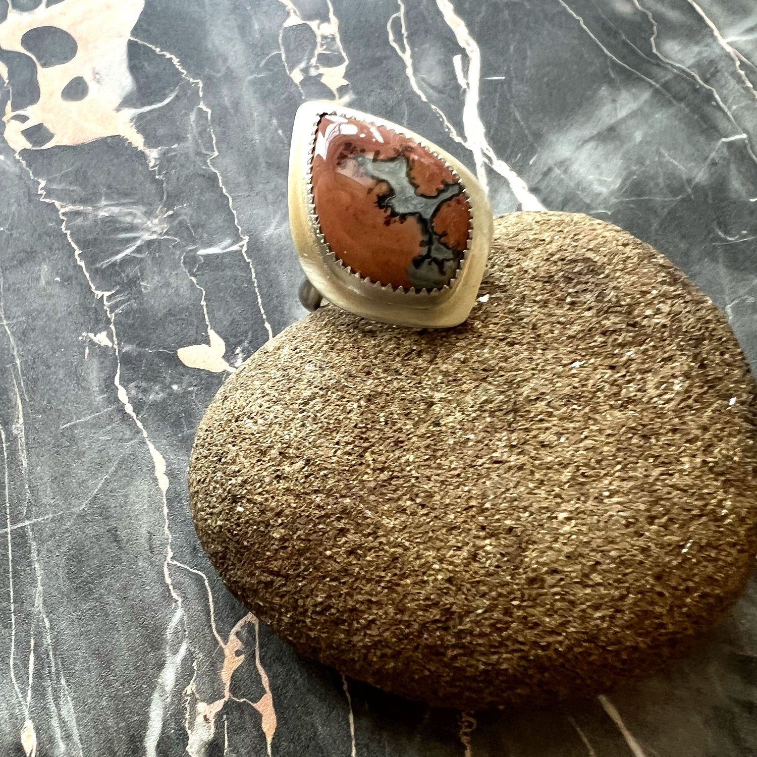 Are you a kindred Mother Earth spirit? Then let this Maligano Jasper Mother Earth ring be a reminder of that for you! The stone is framed in a fine silver serrated bezel and finished with a half-round sterling silver band. It is a stunning combination of red and white with black dendrites. This ring is designed to symbolize our Mother Earth, this warm, lush planetary home with diversified and exotic landscapes. Jaspers are known as the "supreme nurturer" stone. Nurturing is about taking care of oneself and also reaching out to others with this energy in kind.