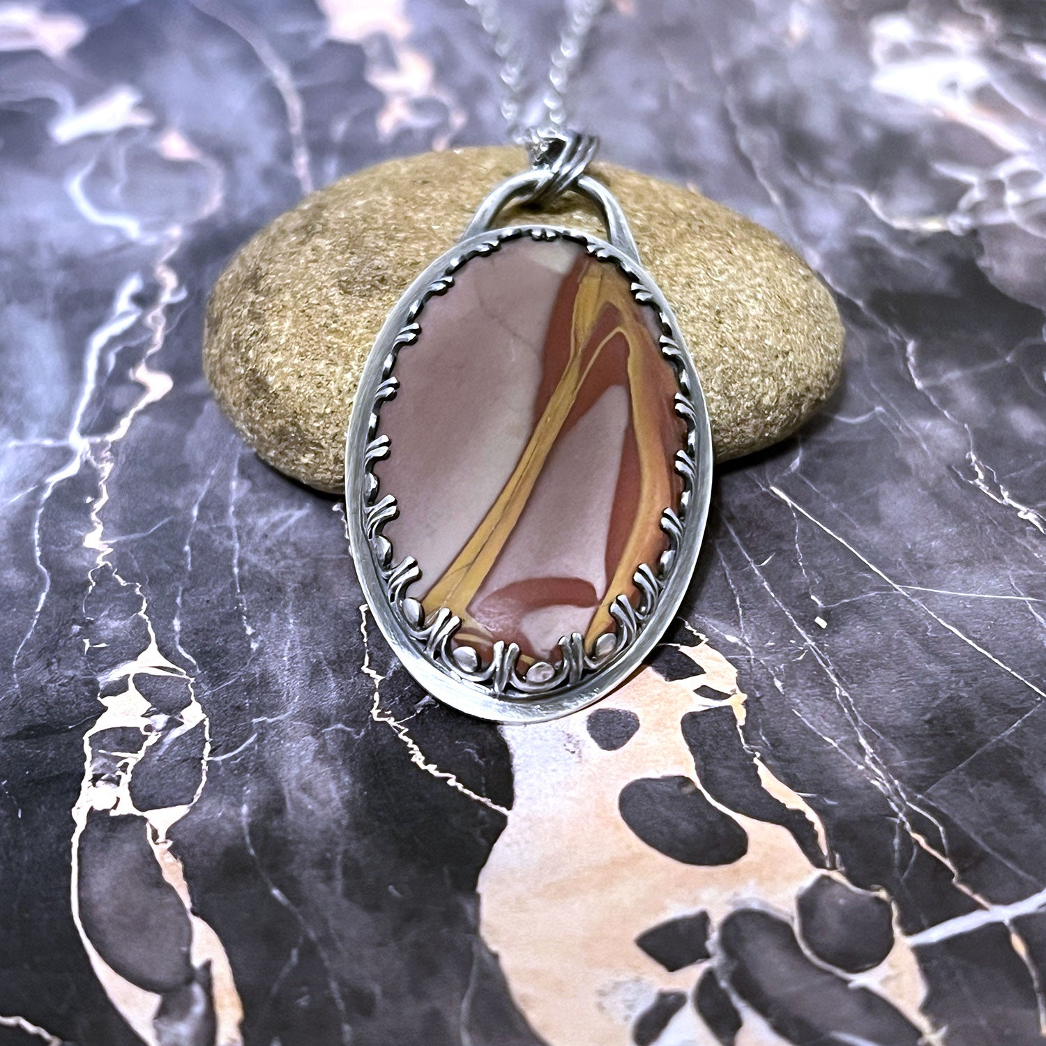 Are you a kindred Mother Earth spirit? Then let this Noreena Jasper Mother Earth necklace be a reminder of that for you! The stone is framed in a sterling silver gallery wire bezel, oxidized and then burnished to a soft glow. It is finished with a handmade bail and an 18-inch sterling silver chain. The stone is a stunning combination of goldenrod, red and mauve. This necklace is designed to symbolize our Mother Earth, this warm, lush planetary home with diversified and exotic landscapes. Jaspers are known as the "supreme nurturer" stone. Nurturing is about taking care of oneself and also reaching out to others with this energy in kind.