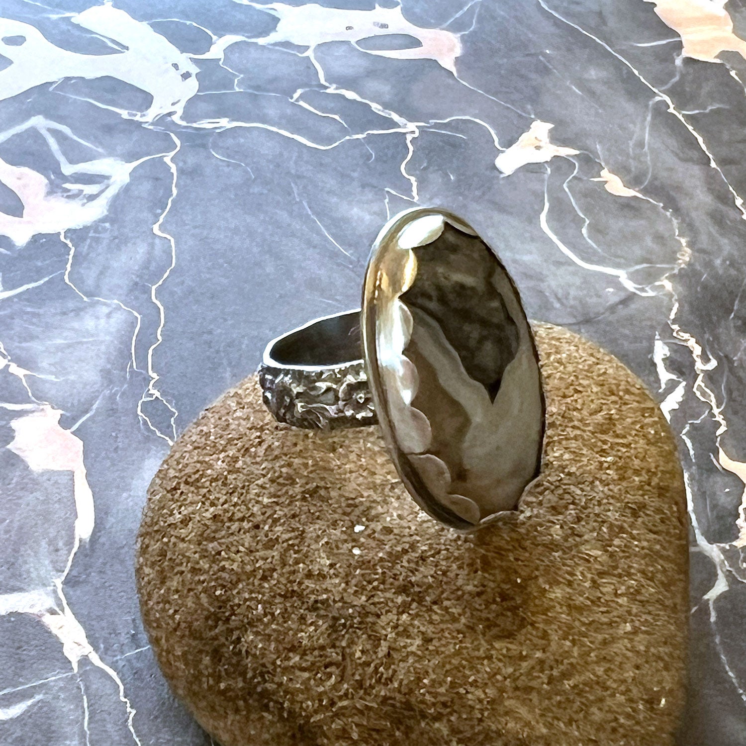 This stunning Ohio Blue Flint cabochon is the focal for this ring. The beautiful dark blue and white colors are captured in a fine silver scalloped bezel and the ring is finished with a floral patterned band. This ring was created to symbolize the elements of fire and earth... flint has historically been used for striking to light fires and for tool making. The sterling/fine silver magnify the qualities inherent in the stone.