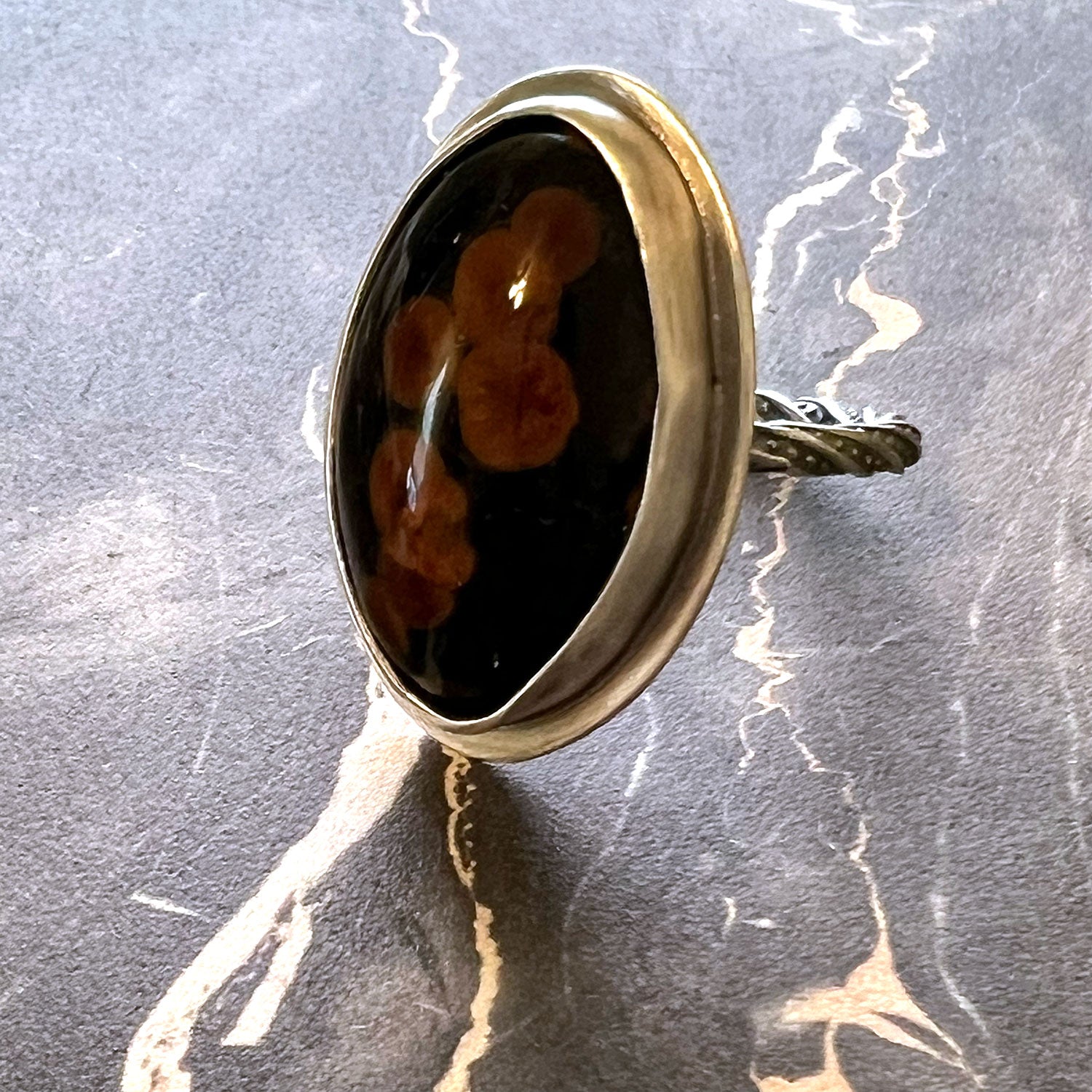 Are you a light bearer? Do you love raising energies? Then this Sterling Silver Peanut Obsidian Ring is made for you! This ring was designed with a focus on bringing to light that which is hidden or unconscious so that it can be transformed. This beautiful black obsidian with caramel and red "peanuts" is very eye catching. Obsidian is known to be a transformational stone and to assist with dissolving negative patterns. Precious metals enhance the natural qualities of the stones. The ring is finished with a fine silver plain bezel and a twisted sterling silver band. It has been oxidized and then burnished to a soft finish.