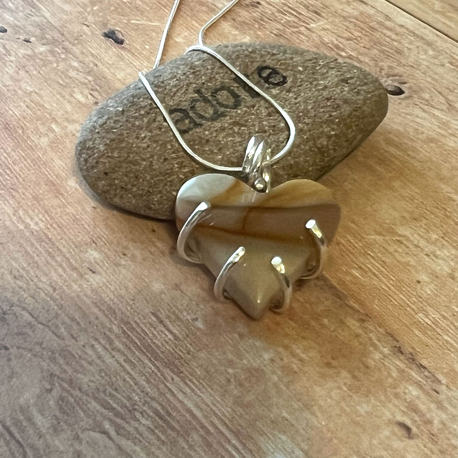 Are you a kindred Mother Earth spirit? Then let this Polychrome Jasper Mother Earth heart necklace be a reminder of that for you! The stone is framed in a sterling silver soldered frame and then tumbled to a bright finish. It is finished with an 18-inch sterling silver chain. The stone is an earth combination of sand with taupe and orange banding. This necklace is designed to symbolize our Mother Earth, this warm, lush planetary home with diversified and exotic landscapes. Jaspers are known as the "supreme nurturer" stone. Nurturing is about taking care of oneself and also reaching out to others with this energy in kind.