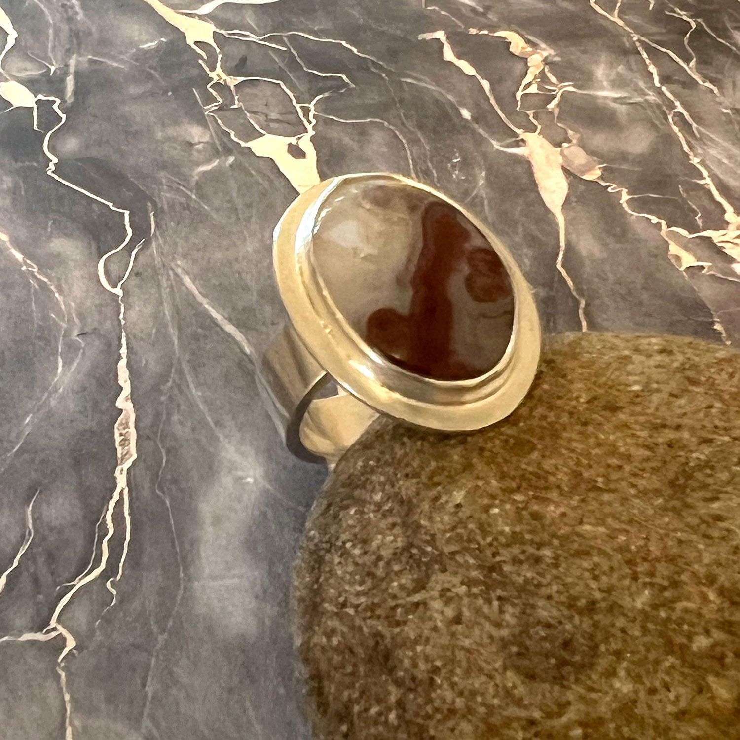 This Red Plume Agate Ring is a handmade talisman created for you that is beautiful, well made, and energized with positive, inspirational, and lifting thoughts. Natural stones and precious metals are eco-friendly and this agate stone will touch your heart! This protective embrace ring will also make a luxurious gift for your bridesmaid, your wife or lover, your mother, a friend, family member, or co-worker.